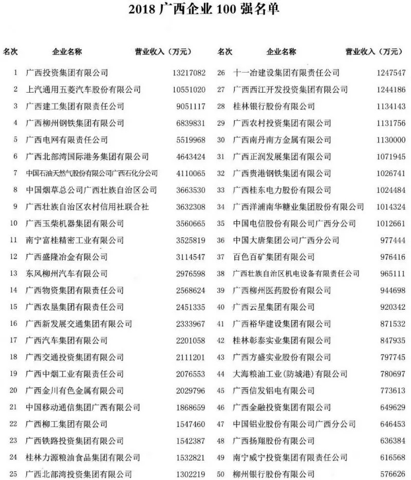大會(huì)揭曉了2018年廣西企業(yè)100強(qiáng),以及廣西民營企業(yè)50強(qiáng)榜單。廣西投資集團(tuán)有限公司、上汽通用五菱汽車股份有限公司、廣西建工集團(tuán)有限公司位列廣西企業(yè)100強(qiáng)榜單前三甲。廣西華業(yè)集團(tuán)旗下子公司廣西華業(yè)建筑工程有限公司以營業(yè)收入41.9億元,位列廣西百強(qiáng)企業(yè)第57名,并躋身廣西民營企業(yè)50強(qiáng)第15強(qiáng)。