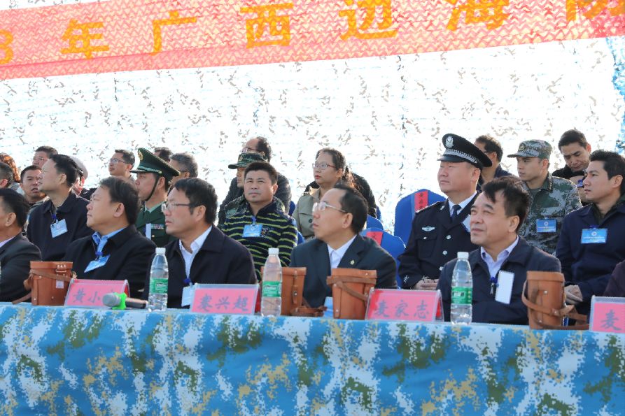 2018年11月23日上午,廣西邊海防軍警民聯(lián)防演練在防城港江山半島白龍珍珠灣海域順利舉行。此次演練由自治區(qū)邊海防委員會統(tǒng)一領(lǐng)導(dǎo),防城港市邊海防委員會和自治區(qū)邊海防委員會辦公室具體承辦,防城港軍分區(qū)、公安邊防、海警、海關(guān)、海事、漁政、海上民兵分隊(duì)和國家緊急醫(yī)學(xué)救援隊(duì)(廣西海上緊急醫(yī)學(xué)救援中心)等單位參加演練。自治區(qū)邊海防委員會辦公室主任黃小寧擔(dān)任演練總指揮,防城港市蹇興超副市長、農(nóng)業(yè)農(nóng)村廳王凱學(xué)副廳長、衛(wèi)生健康委員會麥家志副主任及南部戰(zhàn)區(qū)陸軍、自治區(qū)公安廳、外事辦、海洋局、打私辦、南寧海關(guān)、公安邊防總隊(duì)、海警總隊(duì)等有關(guān)單位領(lǐng)導(dǎo)應(yīng)邀觀摩本次演練活動,廣西華業(yè)投資集團(tuán)董事長龍其生作為特邀嘉賓在主席臺就坐并全程觀摩了演練活動。