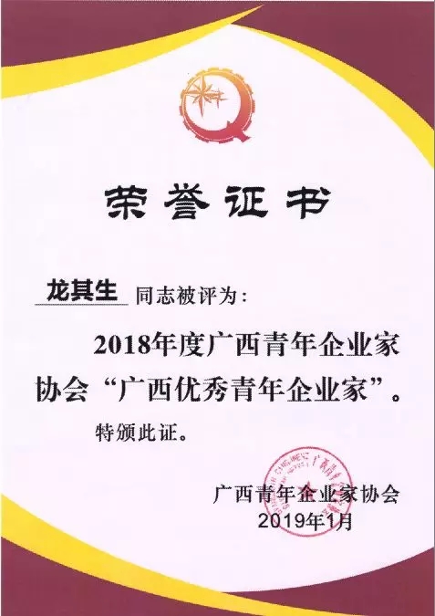 喜訊!華業(yè)集團(tuán)董事長龍其生榮獲2018年“廣西優(yōu)秀青年企業(yè)家”榮譽(yù)稱號(hào)!