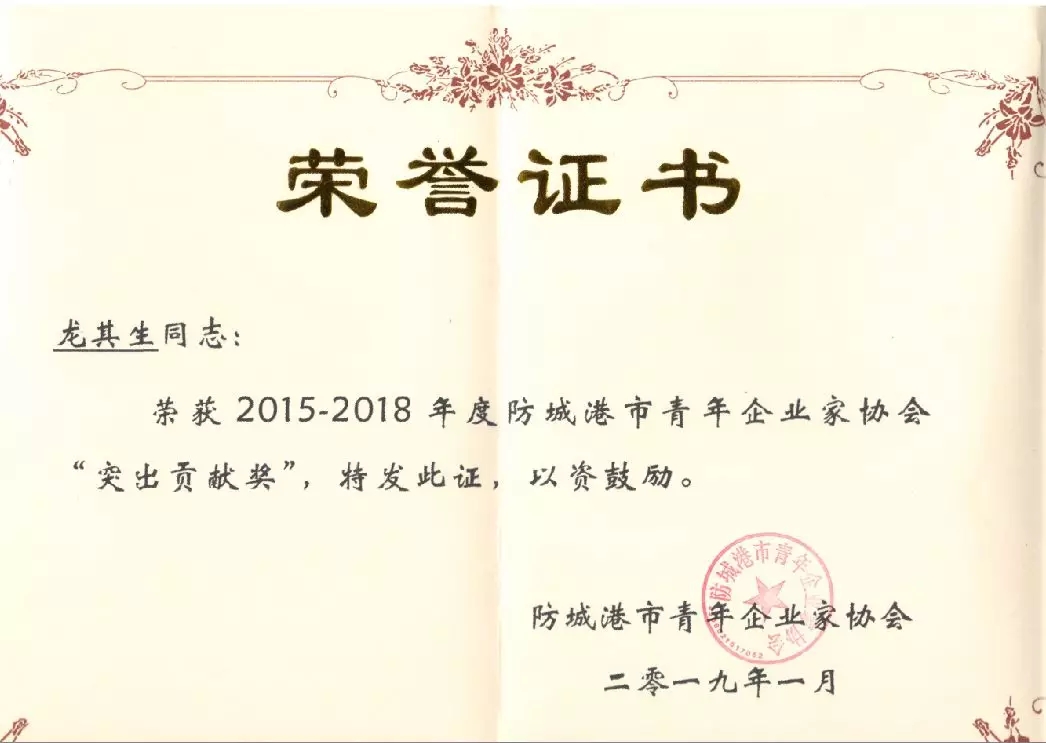 熱烈慶祝廣西華業(yè)投資集團(tuán)有限公司董事長、防城港市青年企業(yè)家協(xié)會(huì)會(huì)長龍其生榮獲廣西青年企業(yè)家協(xié)會(huì)2018年度“廣西優(yōu)秀青年企業(yè)家”榮譽(yù)稱號(hào)和2015-2018年度防城港市青年企業(yè)家“突出貢獻(xiàn)獎(jiǎng)”!防城港市青年企業(yè)家協(xié)會(huì)也榮獲2018年廣西青年企業(yè)家協(xié)會(huì)“優(yōu)秀團(tuán)體會(huì)員”榮譽(yù)稱號(hào)!