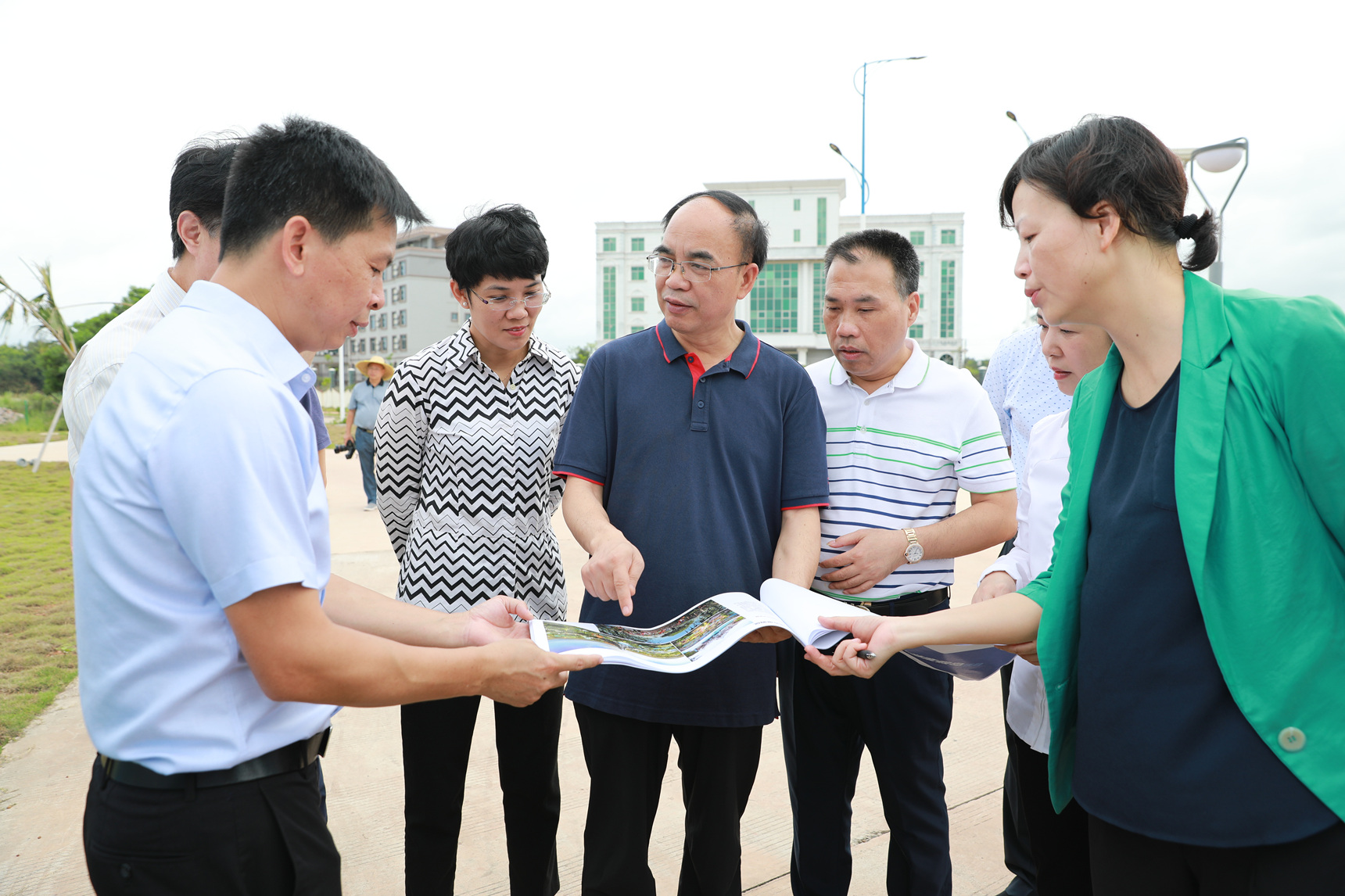 陳潔副部長(前排右三)、溫達(dá)勤巡視員(前排左二)在調(diào)研現(xiàn)場聽取項(xiàng)目建設(shè)情況匯報(bào)