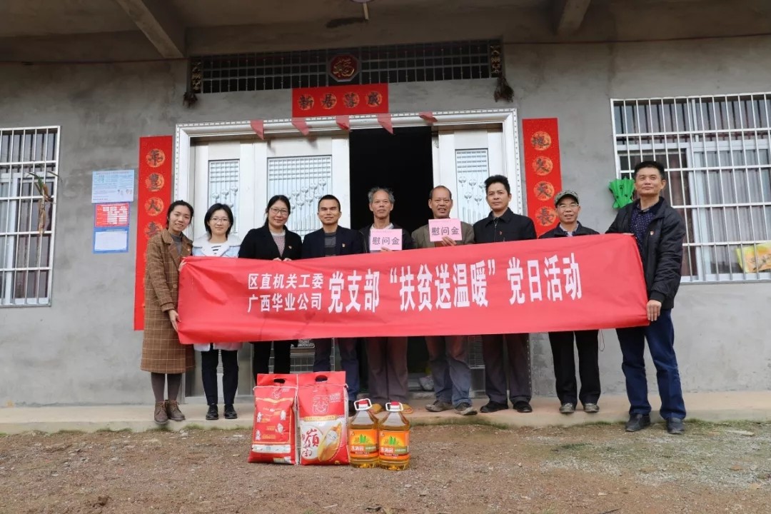 為充分發(fā)揮黨建引領(lǐng)作用,扎實(shí)有效推進(jìn)精準(zhǔn)脫貧工作,2019年1月15日防城區(qū)直機(jī)關(guān)工委黨支部和廣西華業(yè)投資集團(tuán)有限公司黨支部聯(lián)合深入防城區(qū)那良鎮(zhèn)開(kāi)展了以 “扶貧送溫暖”為主題的黨日活動(dòng)。防城區(qū)直機(jī)關(guān)工委書(shū)記許紹銳、副書(shū)記蘇良東、紀(jì)工委書(shū)記宋明雄,華業(yè)集團(tuán)副總裁熊昭斐、工會(huì)主席鐘麗霞帶領(lǐng)兩支部多名黨員一起參加了扶貧慰問(wèn)活動(dòng)。