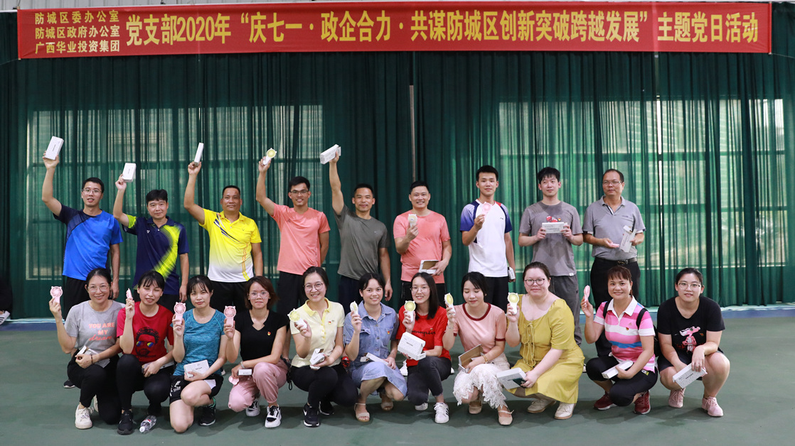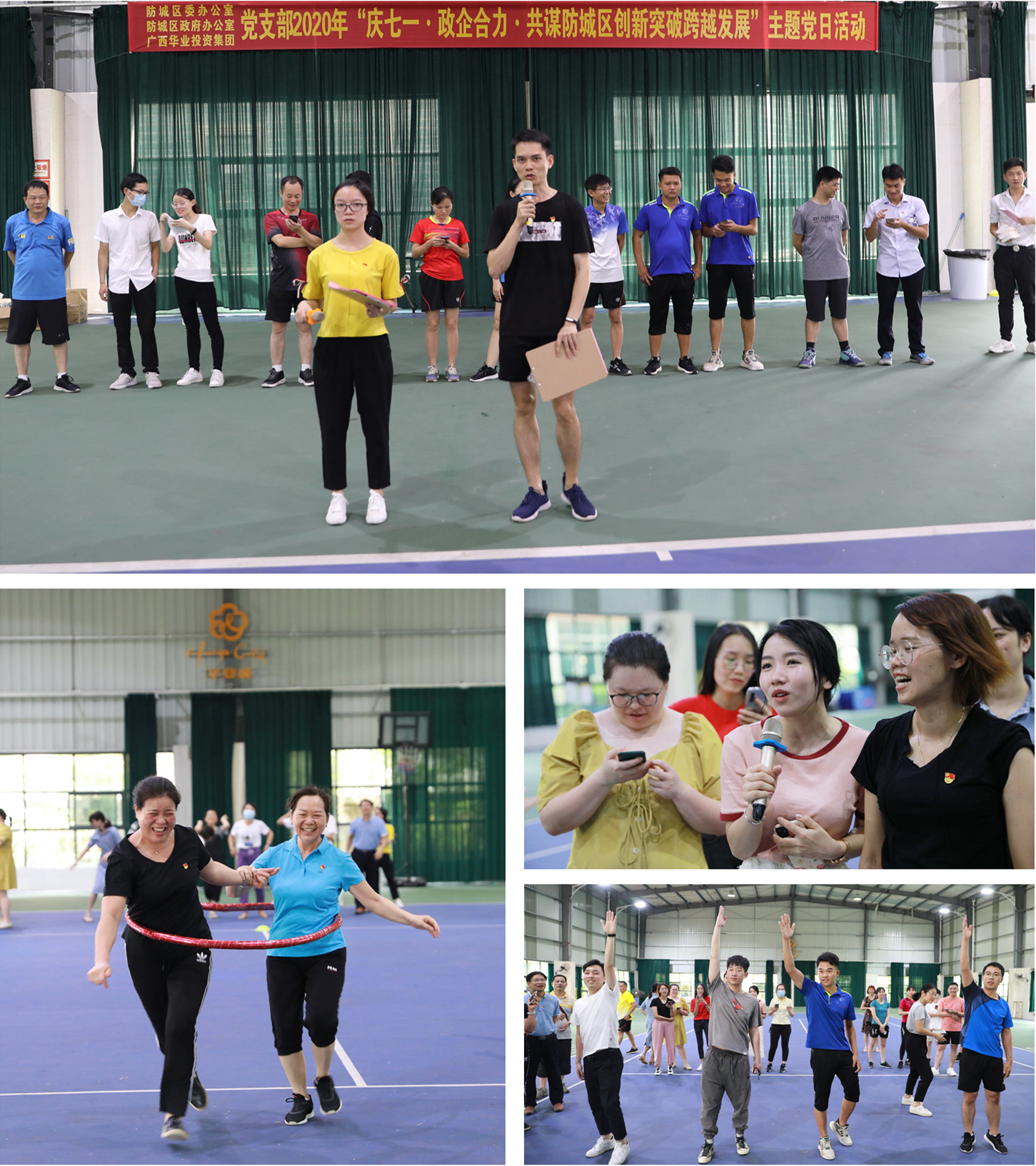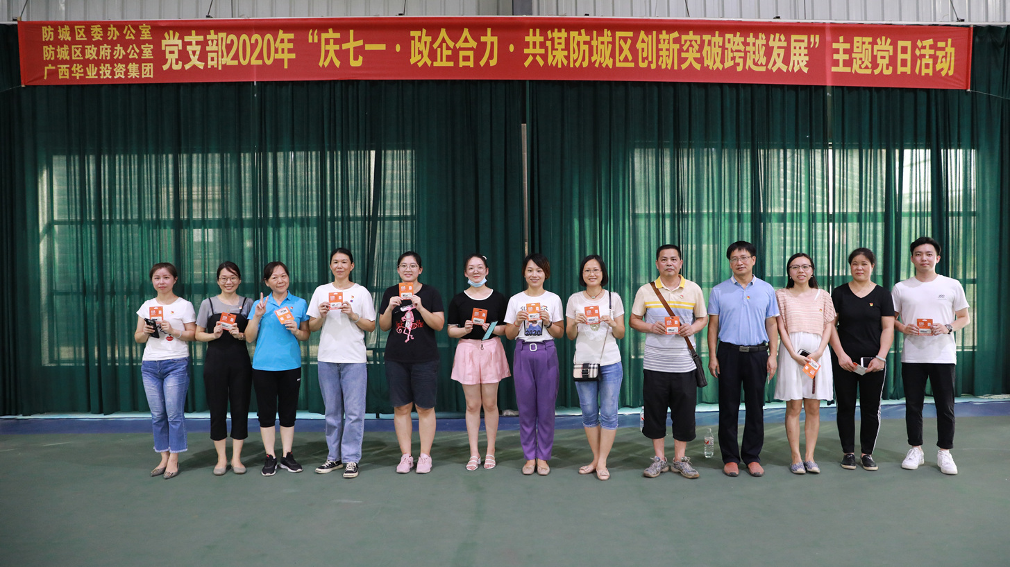 2020年7月3日下午,華業(yè)集團黨支部與防城區(qū)委辦、政府辦黨支部在華業(yè)城聯(lián)合開展“慶七一·政企合力·共謀防城區(qū)創(chuàng)新突破跨越發(fā)展”主題黨日活動。雙方共100多人齊聚一堂,通過參觀黨建展廳、開展黨建知識競答、猜紅歌比賽等黨建活動及氣排球比賽等方式熱烈慶祝中國共產(chǎn)黨成立99周年,為深化政企合作,推動防城區(qū)創(chuàng)新突破、跨越發(fā)展貢獻力量。